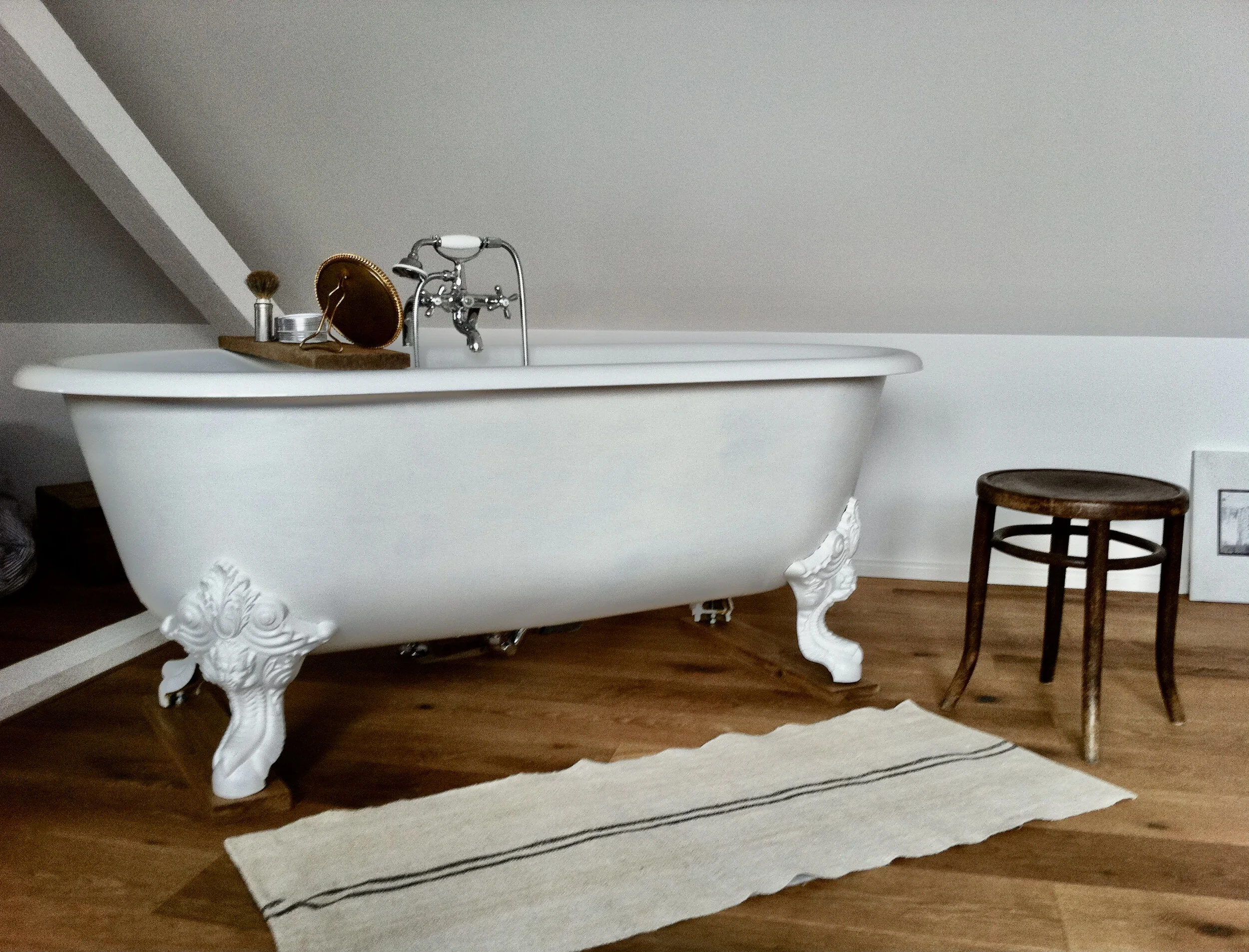 Einfach und Minimalistisch eingerichtet, mit hochwertiger Grundausstattung wie freistehender Badewanne, Armaturen, Porzellanschaltern & -Steckdosen sowie vielen alten, ausgesuchten Möbeln & Gegenständen.
